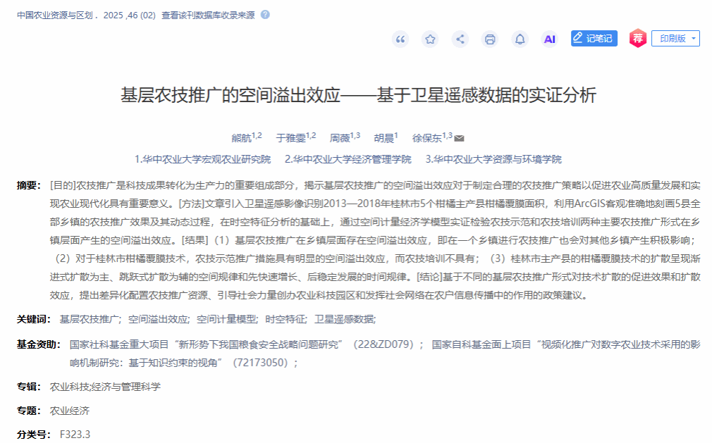 | 目的 农技推广是科技成果转化为生产力的重要组成部分,揭示基层农技推广的空间溢出效应对于制定合理的农技推广策略以促进农业高质量发展和实现农业现代化具有重要意义。方法 文章引入卫星遥感影像识别2013—2018年桂林市5个柑橘主产县柑橘覆膜面积,利用ArcGIS客观准确地刻画5县全部乡镇的农技推广效果及其动态过程,在时空特征分析的基础上,通过空间计量经济学模型实证检验农技示范和农技培训两种主要农技推广形式在乡镇层面产生的空间溢出效应。结果 (1)基层农技推广在乡镇层面存在空间溢出效应,即在一个乡镇进行农技推广也会对其他乡镇产生积极影响;(2)对于桂林市柑橘覆膜技术,农技示范推广措施具有明显的空间溢出效应,而农技培训不具有;(3)桂林市主产县的柑橘覆膜技术的扩散呈现渐进式扩散为主、跳跃式扩散为辅的空间规律和先快速增长、后稳定发展的时间规律。结论 基于不同的基层农技推广形式对技术扩散的促进效果和扩散效应,提出差异化配置农技推广资源、引导社会力量创办农业科技园区和发挥社会网络在农户信息传播中的作用的政策建议。 |